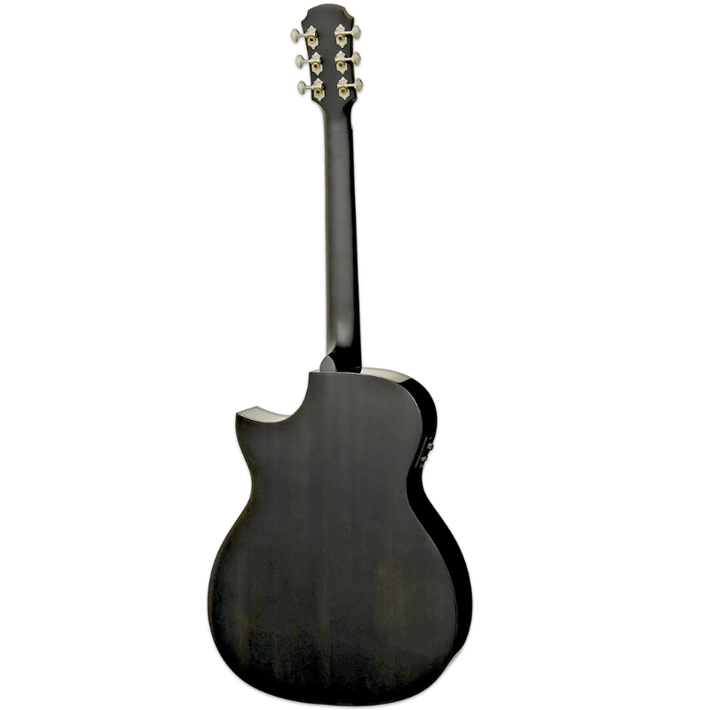 The Aria 201CE OM Size Acoustic-Electric Guitar in black features a solid spruce top for bright tone, mahogany back and sides for subdued warmth, and a rosewood fingerboard for easy playability. It has a Fishman Presys II preamp for clean, amplified sound and a Graphtech TUSQ nut and saddle for increased sustain. The scale length of 650mm and nut width of 43mm give comfortable playability, and sleek black finishing with chrome hardware gives a professional look to the instrument.