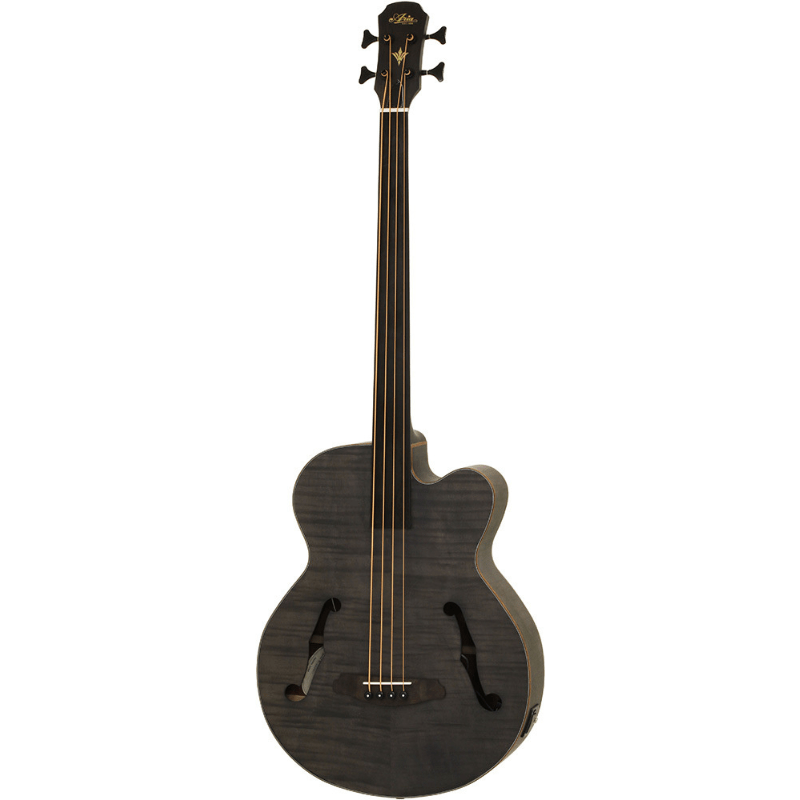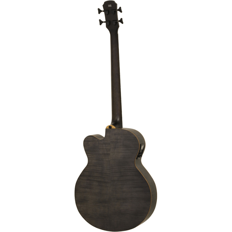 The Aria FEB F2M/FL STBK Fretless Acoustic Bass is constructed for deep booming sounds and comfortable playing. Being made from high-quality flamed nato on the top, back, and sides, it provides a warm, full-bodied sound. The neck material is nato and the fingerboard material is rosewood — fretless, responsive, and comfortable. This one is designed with a piezo pickup and AEQ-4B preamp to give clean, true amplified sounds with pro control, equipped with a 4 band EQ, notch, and tuner. The 34-inch scale, 43 mm bone nut boost the sustain and string spacing, and the sleek stained black finish puts things into 21st century mode.