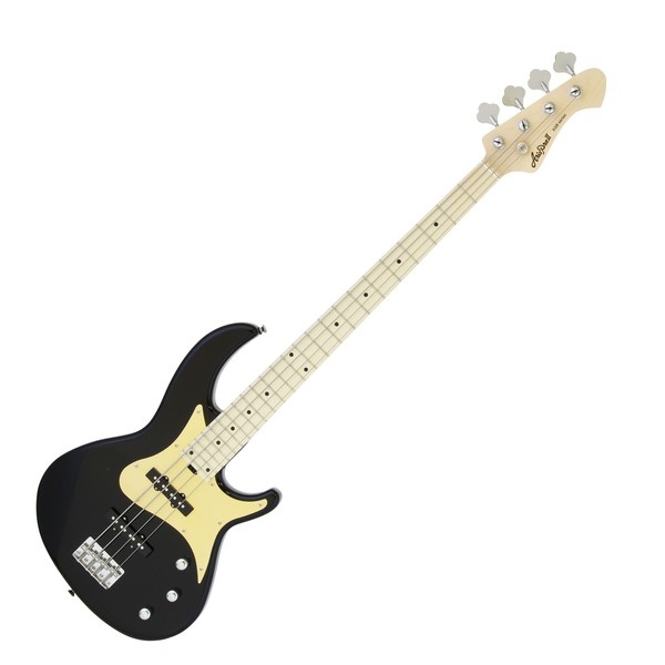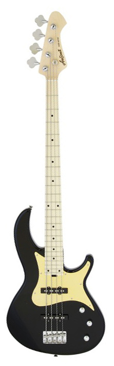 Aria RSB 618 4-String Bass in Black comes with great style and performance. With its lightweight basswood body and maple neck, it is comfortable enough, with 24 frets, 34” scale length making playability easy. It has dual OJ-1 pickups, and it has a punchy, versatile tone. The volume, tone, and balancer controls will allow you to make sound adjustments, and the VFB-1C tailpiece will provide stable tuning. The Gold Anodized pickguard and the chrome hardware make the bass look sleek and modern. Perfect for the players who look for great forwardness and fluid playability.