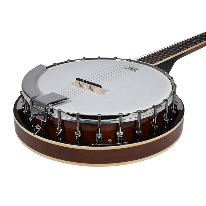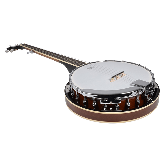 The Chord BJ-5G 5-String G-Banjo combines a mahogany resonator body and neck, hardwood fingerboard, and Remo coated head for authentic bluegrass tone. Features include a floating bridge, chrome-plated armrest, adjustable tailpiece, and open-geared tuners, making it ideal for folk and country musicians.