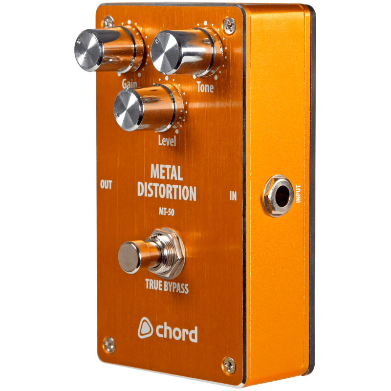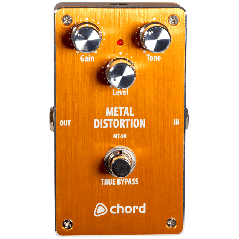 The Chord MT-50 Metal Distortion Pedal produces strong metallic distortion that suits metal and hard rock music, while you can modify its gain and tone details along with level volume. The Metal Dist pedal allows users to achieve high-energy tones by controlling grit and bite levels. The Chord Metal Dist uses a 9V battery or DC power source.
