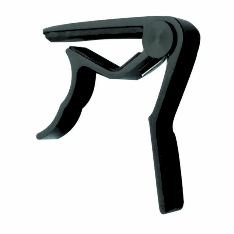 The Chord SC2B Spring Guitar Capo is designed as a sturdy metal device that operates through a spring-powered mechanism. The Chord SC2B Spring Guitar Capo functions flawlessly on acoustic and electric guitars due to its fast deployment and secure attachment system for smooth playing.
