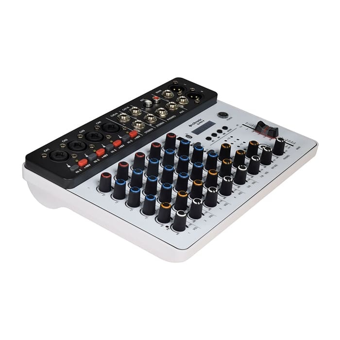 The Citronic Q-Pad 8 Compact Mixer is a small and easy to use 8 channel mixer for live shows and home recording. It connects to your computer using USB-C and works as an audio interface. You can plug in microphones, instruments and stereo devices. It has built in delay effects, Bluetooth streaming and phantom power for condenser mics. Main outputs, headphone output and recording outputs make it great for beginners, podcasters and small bands.