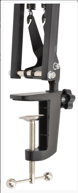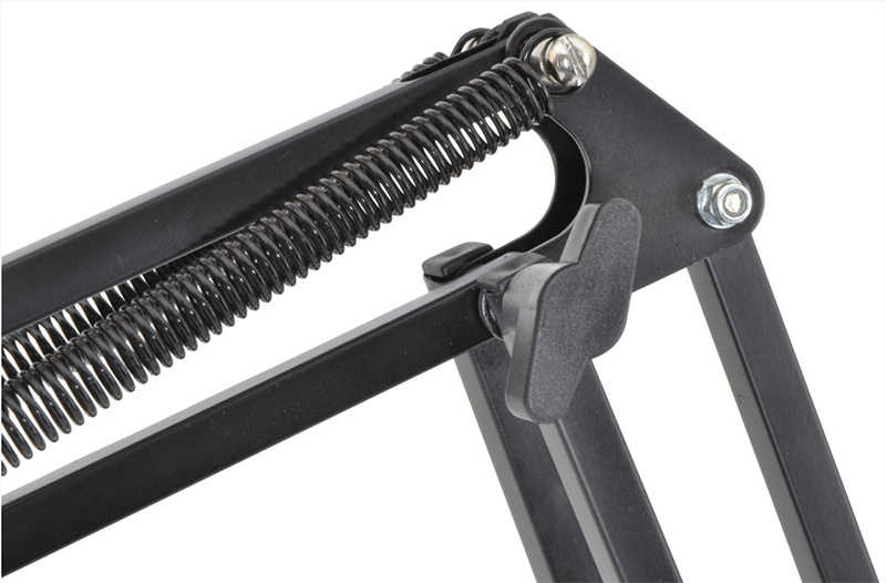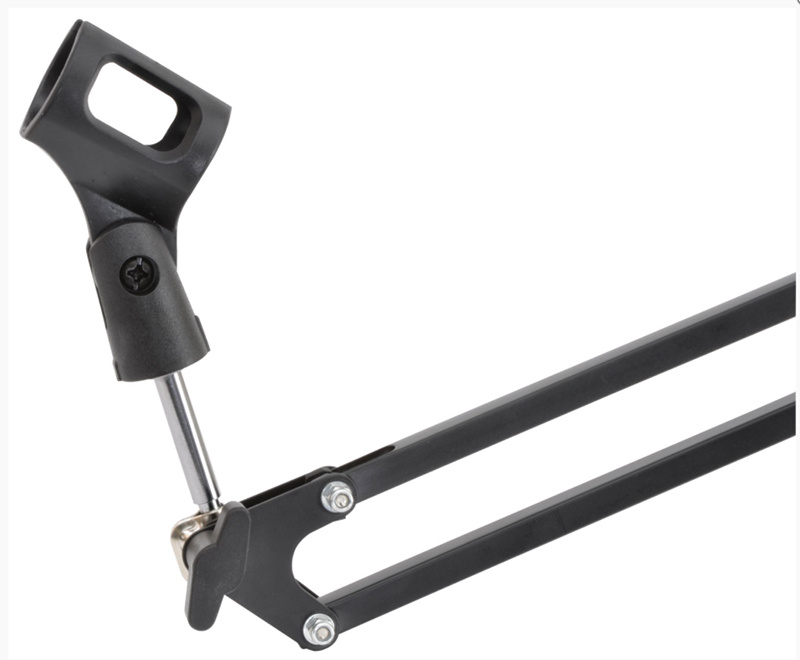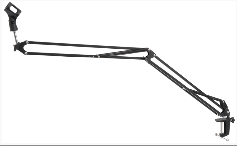 A professional microphone boom arm with desk clamp for studio or broadcasting use. Featuring spring retraction for quick and smooth positioning and a lockable hinge for safety.