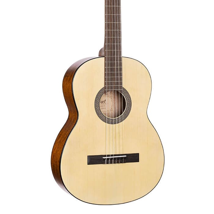 The Cort AC100 Open Pore Classical Guitar offers a warm, balanced tone with a spruce top and mahogany back and sides. It features a dovetail neck joint, traditional fan bracing, and a smooth merbau fingerboard for easy playability. The open-pore finish enhances resonance while showing off the natural wood grain. Complete with a padded bag.
