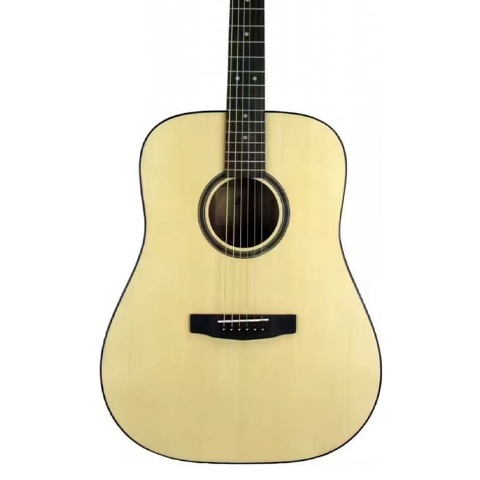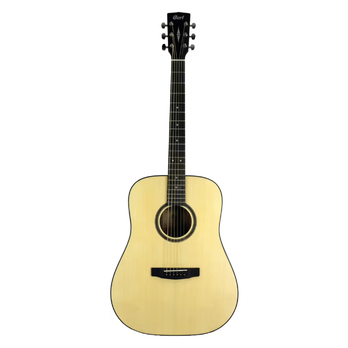 The Cort AD850 Open Pore Acoustic Guitar. The guitar incorporates traditional dreadnought construction through its pairing of spruce top wood with mahogany back and sides for producing well-rounded tonal sounds. The smooth playing feel comes from a mahogany neck along with a merbau fingerboard, while the open pore finish allows the wood to breathe, which improves resonance through its earthy raw appearance.