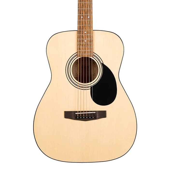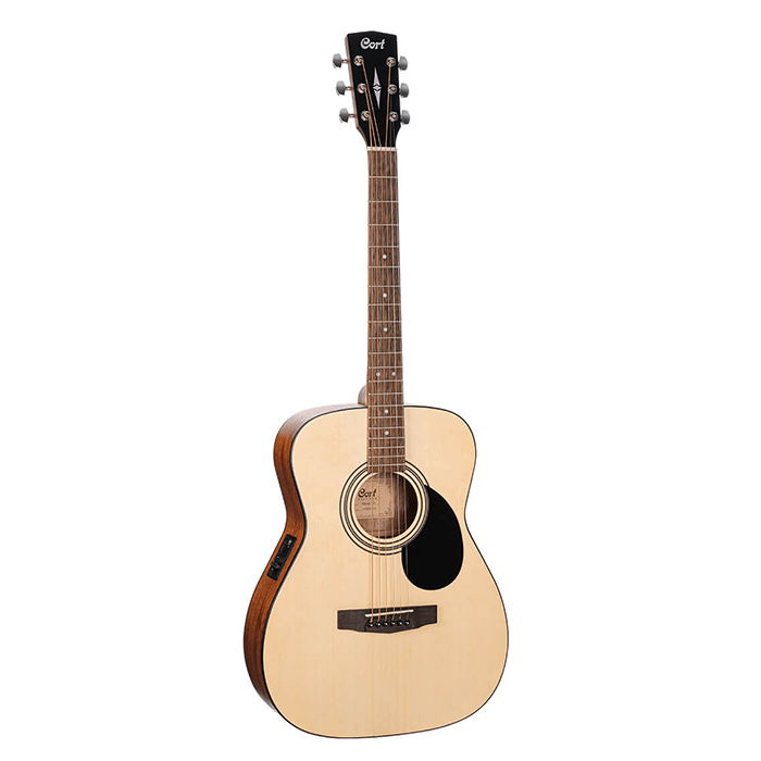 The Cort AF510 Electro-Acoustic blends a concert-size body, bright spruce top, and warm mahogany back and sides for a rich, balanced tone. With Cort® CE304T electronics, die-cast tuners, and an open pore finish, it's a reliable performer for beginners and live players alike.