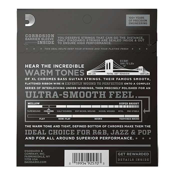 - Like all D’Addario bass strings, XL Chromes are made with our proprietary Hex-Core, ensuring perfect intonation, consistent feel, and reliable durability.