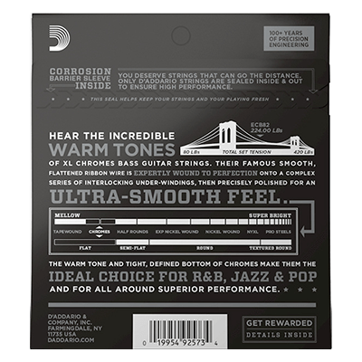 - Like all D’Addario bass strings, XL Chromes are made with our proprietary Hex-Core, ensuring perfect intonation, consistent feel, and reliable durability.