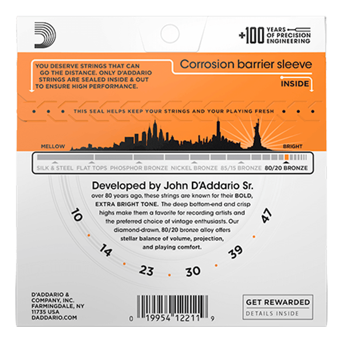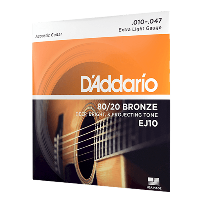 80/20 Bronze strings are our brightest acoustic strings, designed for a sparkling, bold tone. Developed in the 1930s by John D'Addario Sr. and John D'Angelico, they feature a high carbon steel core and 80/20 Bronze wrap for rich harmonics, depth, and powerful projection. The 10-47 Extra Light gauge is easy to play and bend.