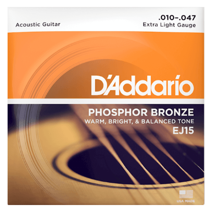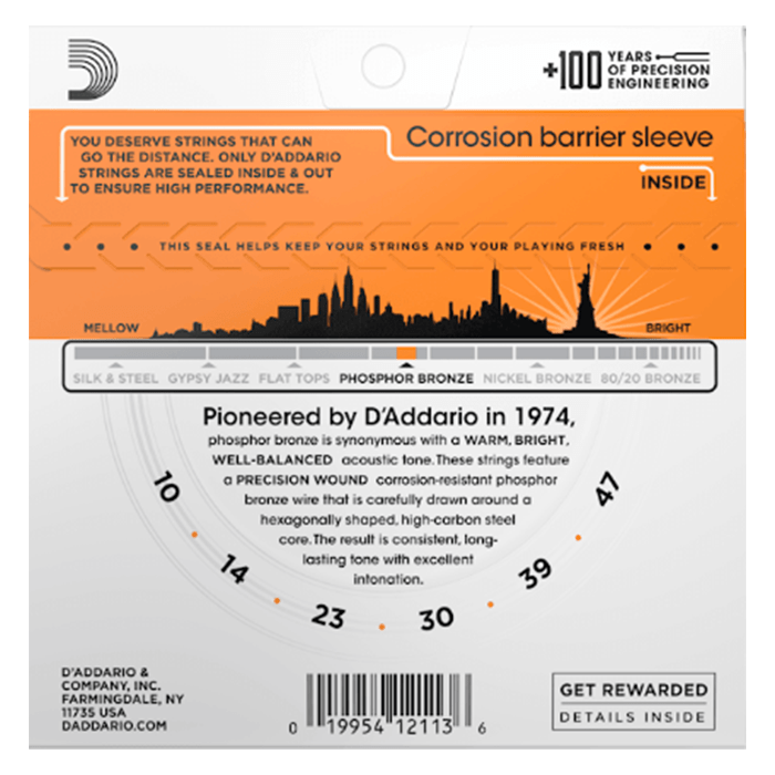 D'Addario introduced Phosphor Bronze acoustic guitar strings in 1974, and they are now considered the standard worldwide for their great tonal balance and warmth. Our Phosphor Bronze strings are precision wound with phosphor bronze wrap wire over a high-carbon steel core, offering versatility for all acoustic styles. The 10-47 Extra Light gauge strings are easy to play and bend.