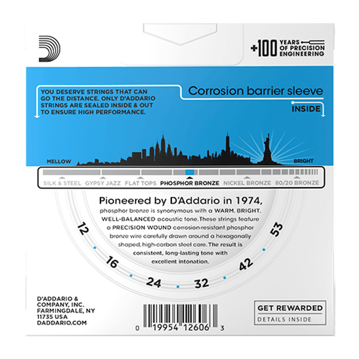 D'Addario introduced Phosphor Bronze acoustic guitar strings in 1974, and they are now the global standard for their tonal balance and warmth. Our Phosphor Bronze strings are precision wound with phosphor bronze wrap wire over a high-carbon steel core, offering versatility for all acoustic styles. The 12-53 Light gauge strings are the most popular choice, balancing playability and tone.