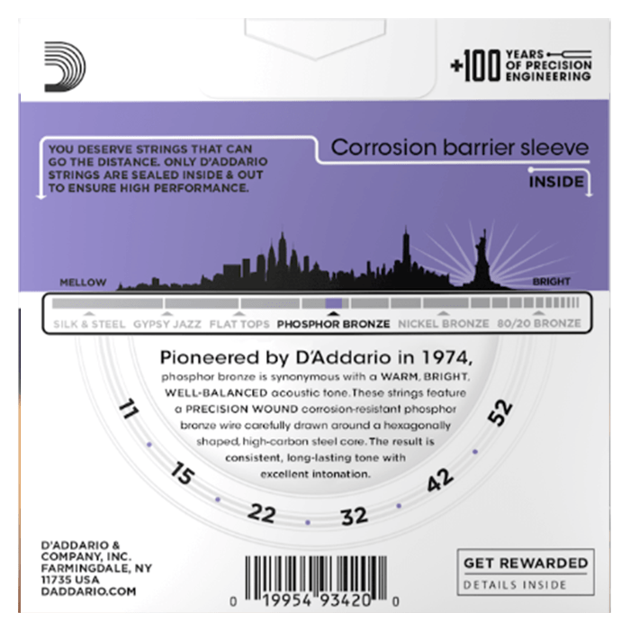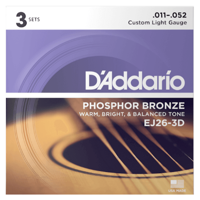 D'Addario first used Phosphor Bronze in acoustic guitar strings in 1974, and it is now the standard worldwide for its tonal balance and warmth. Our Phosphor Bronze strings are precision wound with phosphor bronze wrap wire over a high-carbon steel core, offering versatility for all acoustic styles. The 11-52 Custom Light gauge strings provide slightly more volume and projection than Extra Light while remaining easy to play.