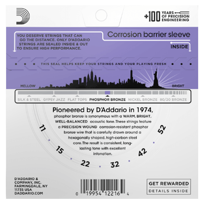 D'Addario introduced Phosphor Bronze acoustic guitar strings in 1974, now widely used due to their sonic balance and warmth. Precision wound over a high-carbon steel core, these 11-52 Custom Light gauge strings offer more volume and projection while being easy to play.