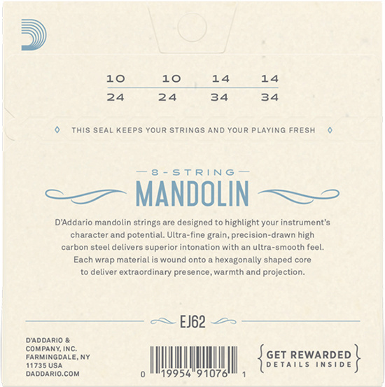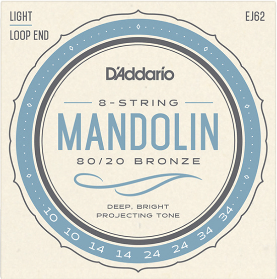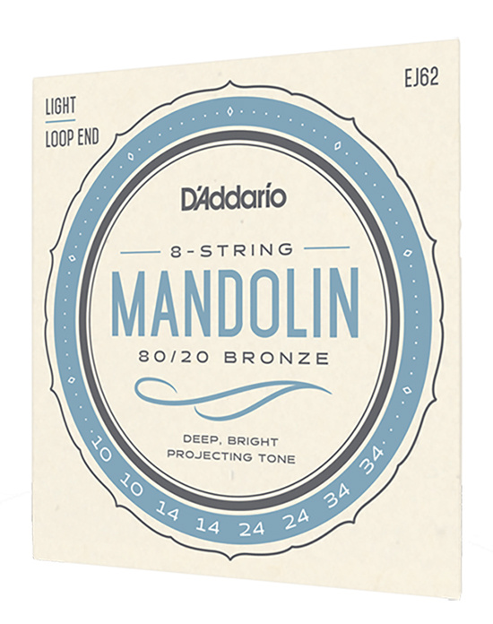 EJ62 is a set of light gauge 80/20 bronze strings for mandolin. This alloy, introduced by John D'Addario Sr. and John D'Angelico in the 1930s, is popular for recording due to its crisp, deep tone and is favored by traditionalists and vintage enthusiasts for its historical significance.