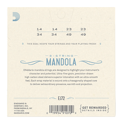 EJ72 is a light gauge string set designed for the Mandola. Since D'Addario introduced Phosphor Bronze guitar strings in 1974, they have been known for their warm and balanced acoustic tone.