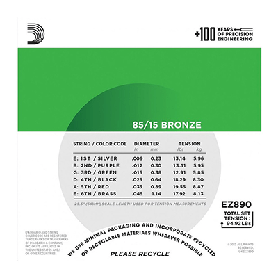 D'Addario 85/15 Bronze EZ Strings use a unique copper-zinc alloy that combines the bright vintage tone of 80/20 strings with the durability of phosphor bronze.