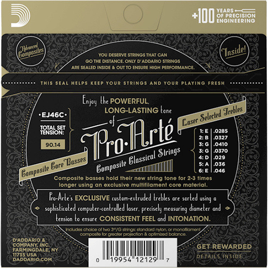 Popular "composite" set EJ46C, in extreme tension, is liked for its harmony of strong, warm tone, cozy feel, and powerful projection. The silver-plated copper was coiled on an innovative Composite core material for a robust and enduring style. For improved point, includes Alternate Composite Third String.