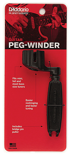 The D'Addario Ergonomic Peg Winder with bridge pin puller is precision molded and specially designed to fit virtually all guitars, basses, ukuleles, banjos, and mandolins. Unlike most other peg winders, the D'Addario Peg Winder is ergonomically designed and built tough to withstand years of use. A great way to have easier and faster string changes.