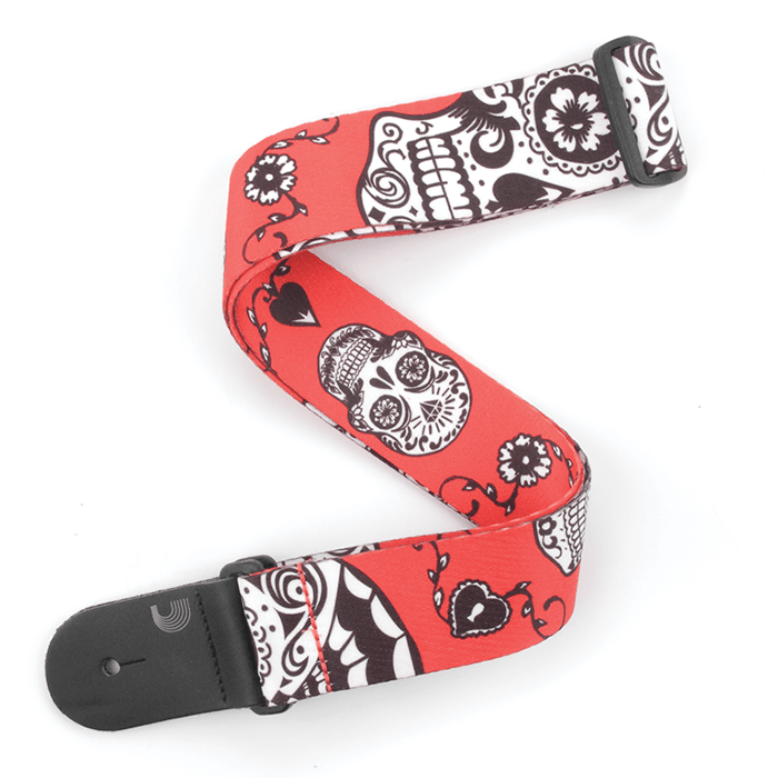 The D'Addario Red Sugar Skulls Polyester Guitar Strap offers both rugged construction and eye-catching design for all musicians across genres. Strong polyester materials create this strap, which presents itself as a resilient accessory that enhances guitar aesthetics. Every guitarist will find the right strap length since it stretches from 39" to 69".