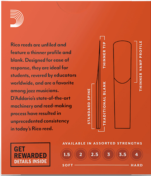 Rico by D'Addario Bb Clarinet reeds are crafted with beginners and educators in mind, thanks to their traditional blank and profile for ease of response, plus unfiled cut for added support. These reeds are available for a full range of clarinets and saxophones to best suit your playing needs.