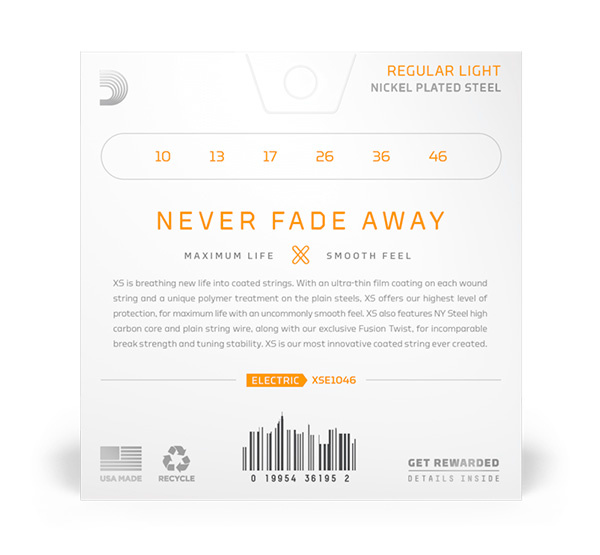 The XS Nickel coated electric guitar strings from D'Addario have the longest lifespan. These high-end electric strings get maximum longevity and a fast, smooth feel thanks to our ground-breaking XS coating, without losing their exceptional tone. Newly developed nickel-plated steel wrap wire, a NY Steel core, and Fusion Twist technology combine to create the XS Nickel strings, which have exceptional strength and tuning stability as well as richer harmonics, more clarity, and astonishing definition with every sweep, slide and bend. Our most popular gauge, 10-46 Regular Light, offers a wonderful blend of tone and playability.