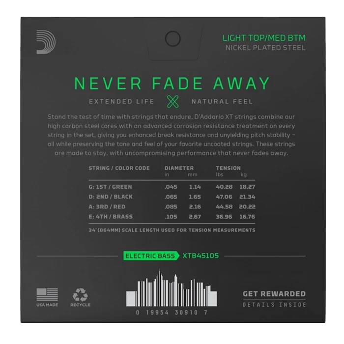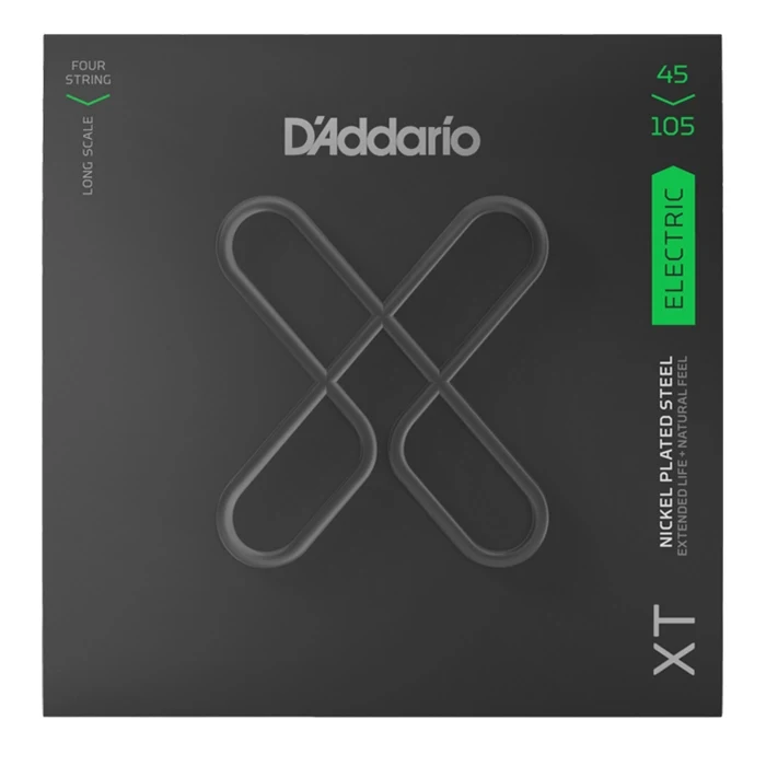 D'Addario XT Nickel 45-105 strings. These coated strings maintain both the strong build and stability features with extended performance. The product unites a NY Steel core with nickel-plated steel wrap while utilizing Fusion Twist technology, which results in reliable durability and multifunctional versatility for musical styles. Players seeking both tight tonal lows and crisp high tones should choose the Regular Light Top/Medium Bottom gauge (45-105).