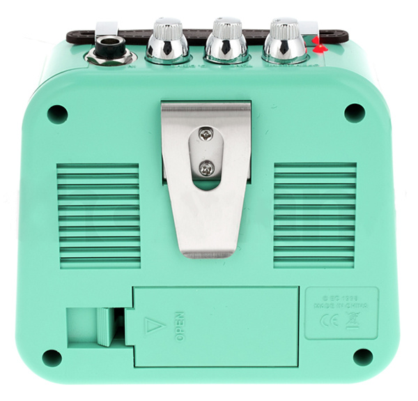 DanElectro Honeytone Mini Amp Aqua. The definitive small portable amp. Great clean or overdriven vintage sound. Louder than most mini amps with a real leather handle, belt clip and headphone jack. Volume, tone & overdrive controls. Powered by a 9V battery (included).