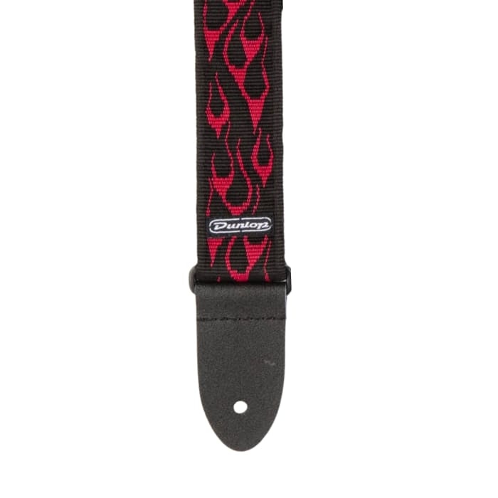 The Dunlop Strap D38-11RD Flambe Red is designed for comfort and reliable use. It features a bold woven flambe red pattern and patented comfort edge webbing to reduce shoulder strain. The strap adjusts easily using custom buckles, offering a length range from 41 to 72 inches. Strong leather ends keep your guitar or bass secure while playing. Durable and comfortable, this strap works well for electric, acoustic, and bass guitars.