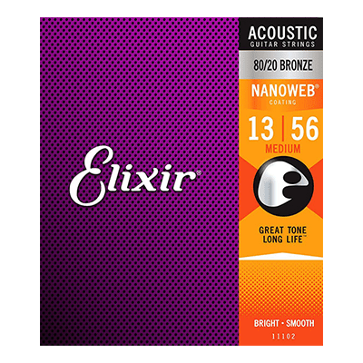 Elixir 13 to 56 Nanoweb 80/20 Bronze Acoustic Guitar Strings deliver a clear, bright tone with longer life. The NANOWEB coating protects against dirt and corrosion while reducing finger squeak. Medium gauges (.013, .017, .026, .035, .045, .056) ensure smooth playability and consistent sound. Anti-rust plated plain steel strings maintain tone and durability.