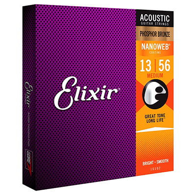The Elixir 16102 Phosphor Bronze Nanoweb Medium Guitar Strings (13-56) are acoustic strings with a medium gauge (.013-.056) and a Nanoweb coating. Made from phosphor bronze, they offer warm, sparkling tone and extended life. The smooth coating improves playability, reduces finger squeak, and the anti-rust plating protects against corrosion for consistent sound quality.