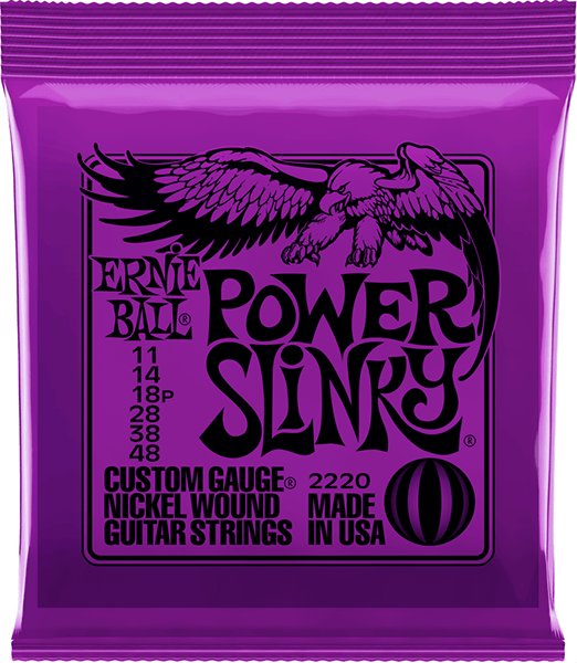 The Ernie Ball 2220 Power Slinky Wound Guitar Strings Nickel Power Slinky strings provide a heavy touch to guitarists who want clear tones. The strings consist of nickel-plated steel that wraps the core made from tin-plated hex-shaped steel to generate a full and balanced listening experience. Your playing strength and stability, together with a clear, cut-through sound, will come from high-carbon steel in the plain strings. Gauges .011, .014, .018p, .028, .038, .048