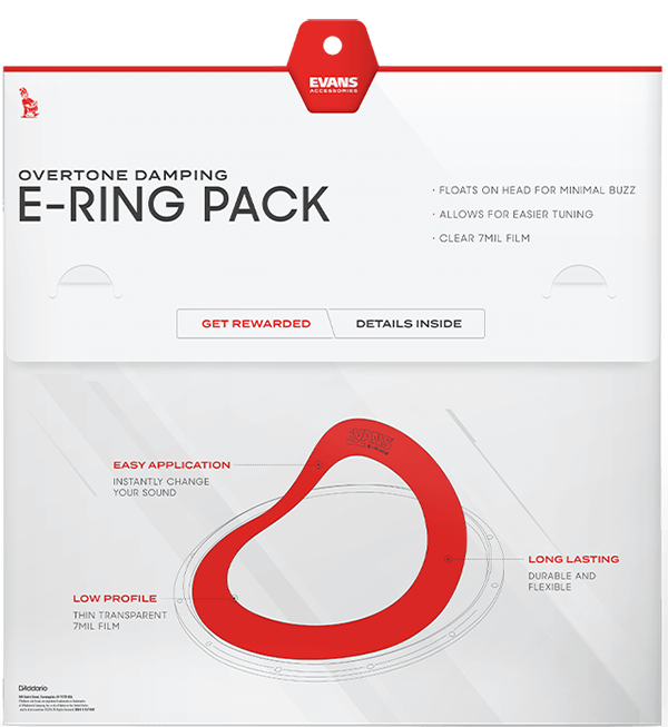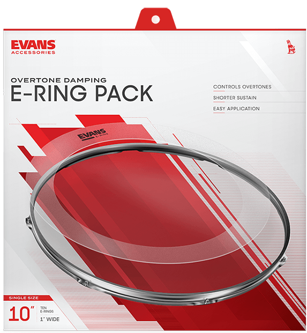 The Evans E-Ring is an easy-to-use external overtone control ring for drumheads that floats on the surface of a drumhead to remove overtones and flattens the drumhead's sound, allowing for easier tuning.