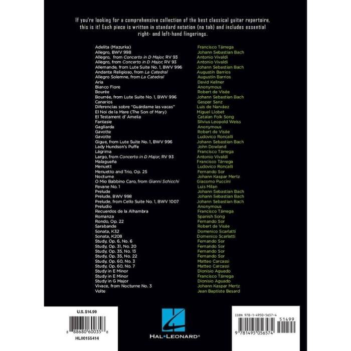 First 50 Classical Pieces You Should Play On Guitar is a beginner friendly classical guitar book. It includes 50 well known pieces written in standard notation. Fingerings for both hands are clearly shown. This helps improve reading, technique, and tone control. The music comes from famous classical composers.
