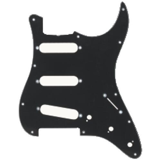 Black Stratocaster Pickguard, standard cutting to fit 3 single coils pick ups, 3 knobs, and a 5-way toggle switch. 11 Screw Holes.