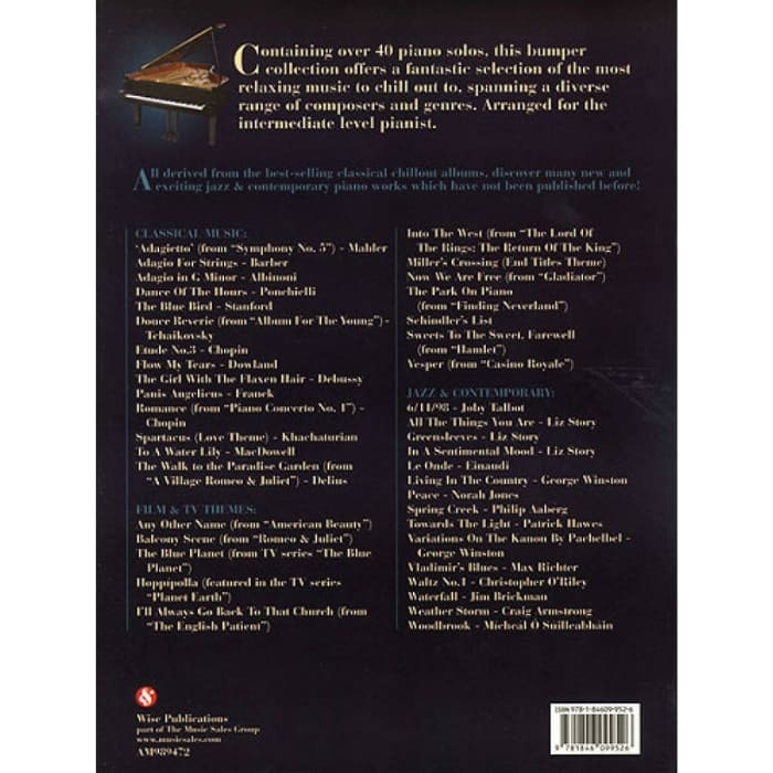 Great Piano Solos: The Classical Chillout Book offers over 40 piano solos for intermediate players. The collection includes classical, jazz, film, and contemporary pieces. Arrangements are designed for smooth playability and musical expression. This book helps improve finger control, timing, and confidence while enjoying relaxing, inspiring music.