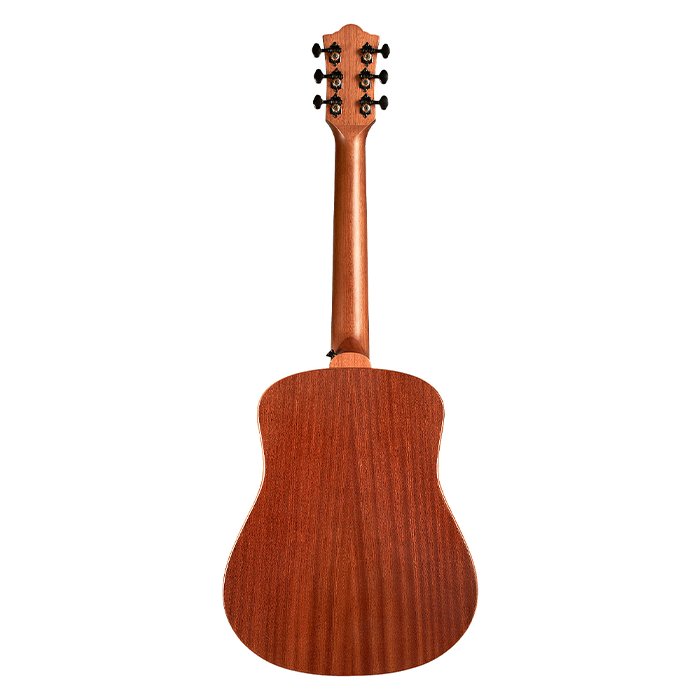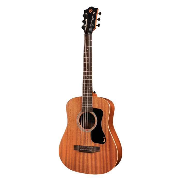 The Guild® Traveler™ is the perfect road-ready guitar, featuring a compact body, short scale length, archback design, and all-Mahogany construction. It combines style and functionality with a Rosewood fingerboard and bridge, all-black hardware, and Guild Vintage 16 tuning machines. The mini dreadnought acoustic has a modern, understated look with a natural satin finish that showcases its Mahogany wood grain. It also includes a deluxe gig bag for easy protection and transport, making it ideal for any musical journey, from the couch to the campfire.