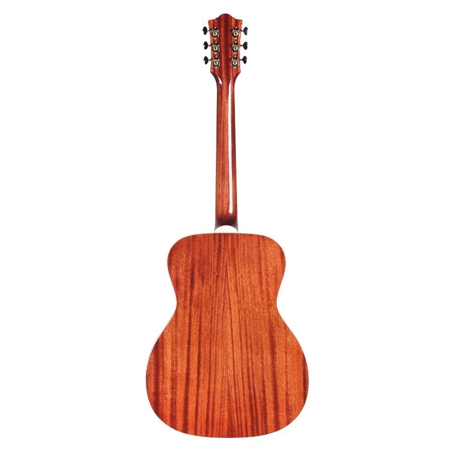 This mid-sized orchestra shaped acoustic is equally suited for strumming and fingerpicking, and produces a sweet, balanced tone. It features the iconic Chesterfield headstock emblem reminiscent of 1960s Guilds, period-correct tortoiseshell pickguard, and includes the Guild’s new lightweight polyfoam case.