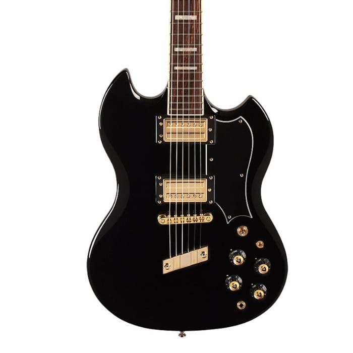 The Guild Polara Kim Thayil In Black is a solid body electric guitar with a mahogany body and neck. It uses HB 1 humbuckers for powerful and clear tone. The vintage soft U neck feels solid and comfortable. A compensated stop tail helps improve sustain and tuning stability. The shorter scale length makes it easy to play.