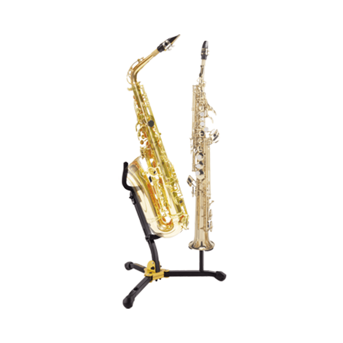 The HERCULES Saxophone Multi-Stand DS533BB securely holds a Tenor or Alto Saxophone with its folding yoke, adjustable backrest, and locking pins. It also includes a peg for a Soprano Saxophone. Comes with a recyclable, eco-friendly storage bag made from non-woven fabrics.