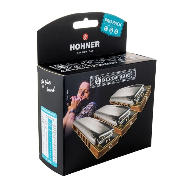 The Hohner Blues Harp Pro Pack Harmonicas C, G, A is perfect for players who want essential blues keys in one set. Each harmonica has a double lacquered doussie wood comb for comfort and moisture control. Brass reeds produce a warm, powerful tone. Stainless steel cover plates add strength and projection. The MS modular design allows easy part replacement.