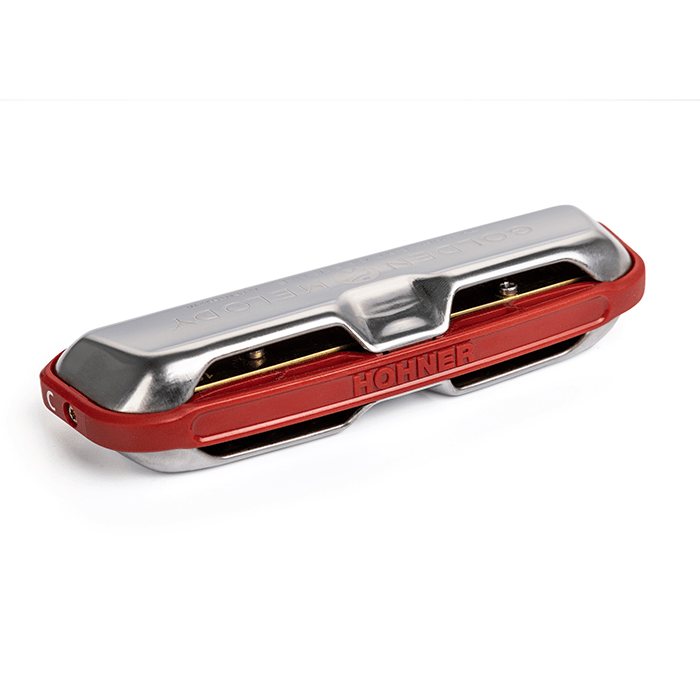 The Hohner Golden Melody Progressive C Major is a 10-hole diatonic harmonica with 20 brass reeds, 0.9 mm brass reed plates, a red ABS comb, and stainless steel covers. Compact and durable, it delivers smooth playability, warm tone, and comfort for every performance.