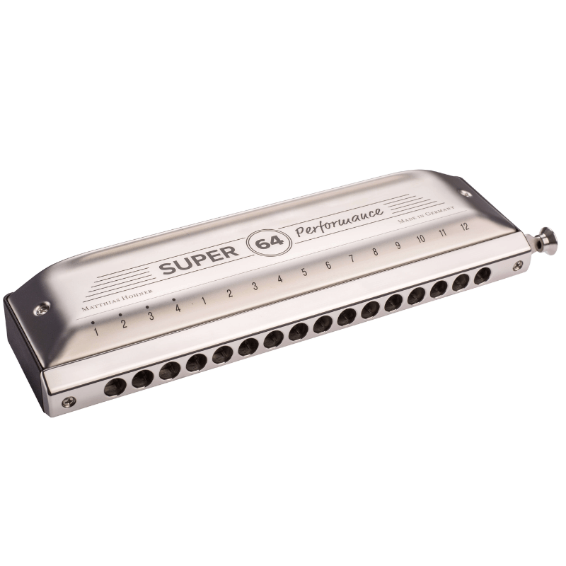 The Hohner Super 64 Chromatic Harmonica establishes new benchmarks through its SilentSlide technology combined with the VarioSpring system and optimized comb chambers which deliver rapid response. The instrument incorporates durable screw-mounted reed plates which promote easy maintenance operations and decrease the instrument's wear. This product comes with a multi-use nylon case that can function as a working station.
