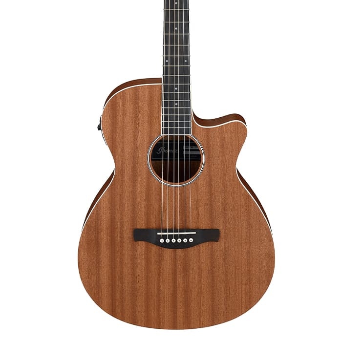 The Ibanez AEG7MH-OPN Electro Acoustic Guitar features a slim AEG body, sapele tonewood, and an open pore finish for warm tone and natural feel. It includes an Ibanez AEQ-2T preamp, onboard tuner, and chrome die-cast tuners for easy amplification and performance.