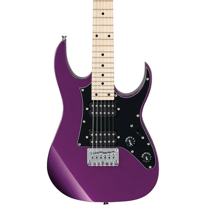 The Ibanez GRGM21M-MPL Gio Mikro RG Metallic Purple delivers big tone in a small design. It features a poplar body, maple neck, 24 frets, and dual humbuckers for clear, powerful sound.