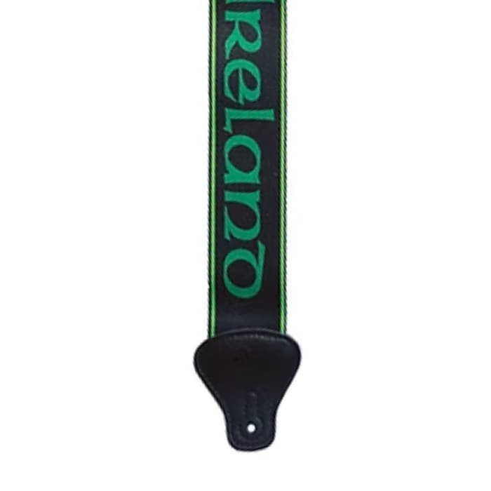 The Ireland Knot Guitar Strap Green On Black is 2 inches wide with leather ends and adjustable length. Its Celtic knot design adds style while providing comfort and stability for electric and acoustic guitars.