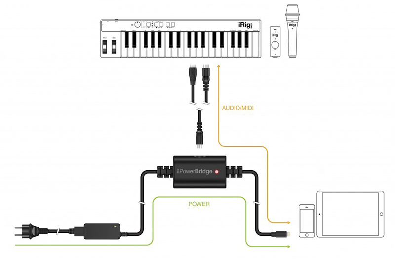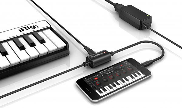 iRig PowerBridge doesn’t magically stop devices from consuming power but offers an alternative. What iRig PowerBridge offers is the ability to plug your iOS device into an outlet and STILL use an iRig device to make music. It is compatible with pretty much all 30-pin or Lightning digital IK gear — like iRig Mic HD, iRig HD, iRig Keys, iRig PRO or iRig MIDI 2.