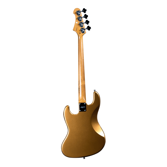 This Jet JJB300 Bass Guitar delivers both classic-sounding tones and smooth ease of play combined with an attractive gold finish. This versatile bass instrument combines features that include a Modern C-shape Canadian roasted maple neck with a paired roasted maple fretboard to produce warm tones. Stable tuning and reliable performance come from this bass instrument thanks to its vintage-style chrome machine heads, together with a bone nut and a double-action truss rod. The instrument's 12" fretboard radius makes the guitar comfortable for users to play both rhythm-based music and solo works.