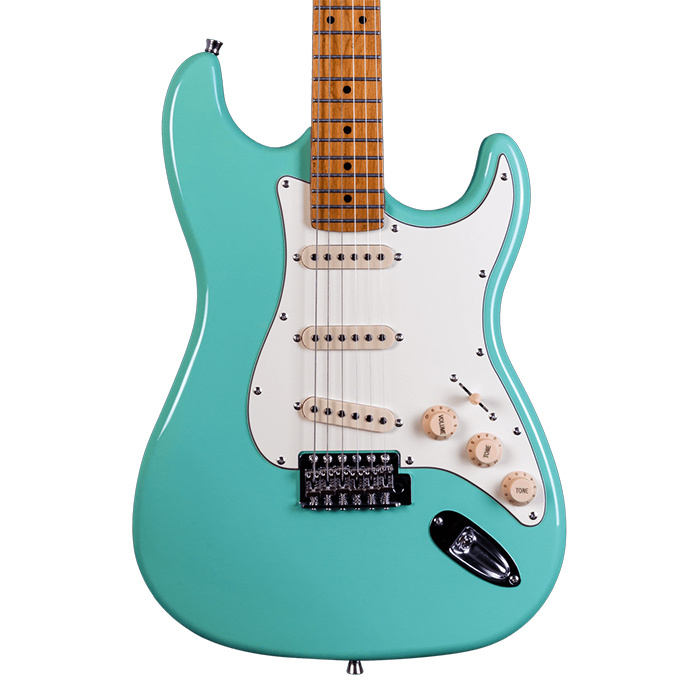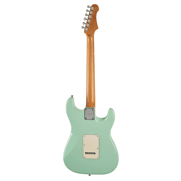 The Jet JS300 Electric Guitar in classic design combines the charm of vintage appearance with contemporary features for optimal use. The neck comes with Canadian roasted maple construction and a Modern C profile that provides an ergonomic and natural playing experience. During play the roasted maple fretboard enhances sonic output and sustain performance through its optimized 9.5” radius that gives players excellent bending capabilities. The device functions reliably in stages and studios because it contains chrome machine heads for tuning stability, along with a bone nut for enhancing resonance and a double-action truss rod for keeping it durable.
