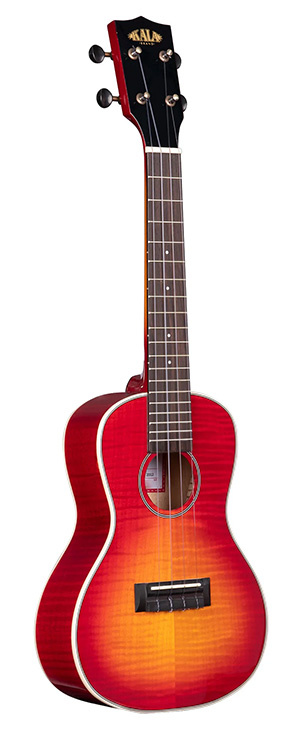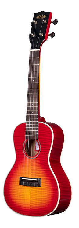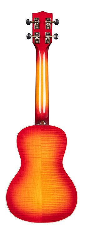 Gloss Flame Maple ukuleles include a warm red Cherry Burst or an earthy brown Tobacco Burst that fades from the borders to a golden center as accent colors. White binding and a glossy, gloss finish frame the wood grain's iridescent stripes. These instruments are not only stunning to look at, but Maple also offers a clean, transparent tone, lots of projection, and excellent note separation. obtainable in tenor and concert models.